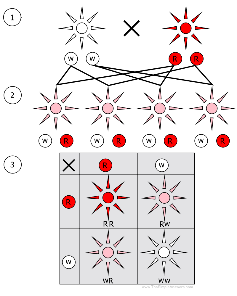 In the example in this picture, the common “4 O’clock” flower, which I grow in my own yard, has many varieties with different blossom colors, among them red and white. In this picture, which I borrowed from Wikipedia, if a plant with white blossoms is crossed with a plant with red blossoms, the resulting seeds will in the first generation primarily be pink; the second generation however will result in genetic differences appearing; in a 1:2:1 ratio. In other words, in the second generation 25% will be white like the mother plant, 25% red like the father plant, and 50% will be pink as a cross between the two.