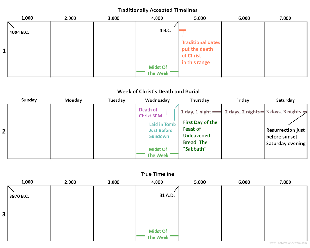 Christ had to die, and be laid in the tomb, in the middle of the “week” – just as literally in the 7000 year week, as in the daily week. This means Christ HAD to die within the 4th “day” – NOT 33 years into the next “day!” Timeline #1 CANNOT be correct! Christ HAD to be cut off IN the midst of the week, not outside of it!