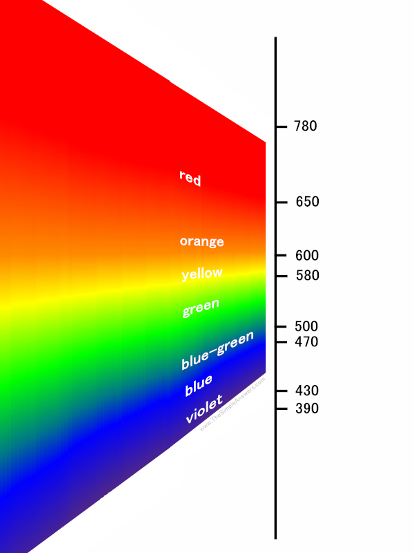 Here you see that almost half of the chart is red. Roughly 150 nanometers. Another 50 for orange, about 40 for yellow, and so on – with the remainder of the chart being about 40 nanometers for each color. This is strange, for it would seem logical that the chart is symmetrical.