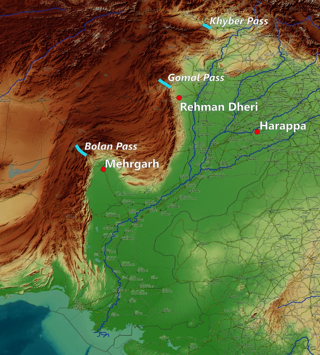 This is one of the few passes through the forbidding mountains that block Pakistan off from the west, and by far the most famous. However, it is unnecessarily far north to continue the line from Susa-Anshan-east. Making the one meant more likely to be the Gomal or Bolan; and for both of these we have clear evidence of IVC fortifications. Controlling the Gomal, we have Rehman Dheri: