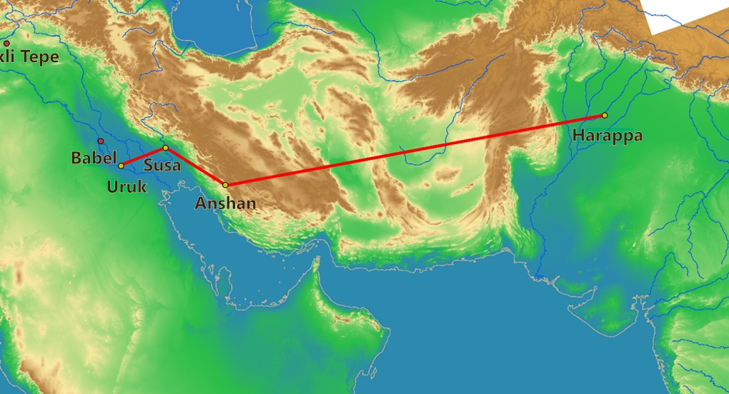 At the top of this picture near the center, you will see that Shortugai is correctly included as part of the IVC, as was everything that could possibly have been in the direction traveled by Enmerkar’s messengers. Anything past the 6th mountain range or so would have been Indus, which is to say Arattan, territory.