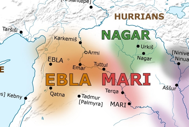 Still further to the NW, we find the civilization of Aram; this is mentioned in the Bible in the time of Abraham, approximately ‑1950, as having been located between the two rivers in the upper reaches of Mesopotamia, in what is now Syria – or between Ebla, Mari, and Nagar on the map.