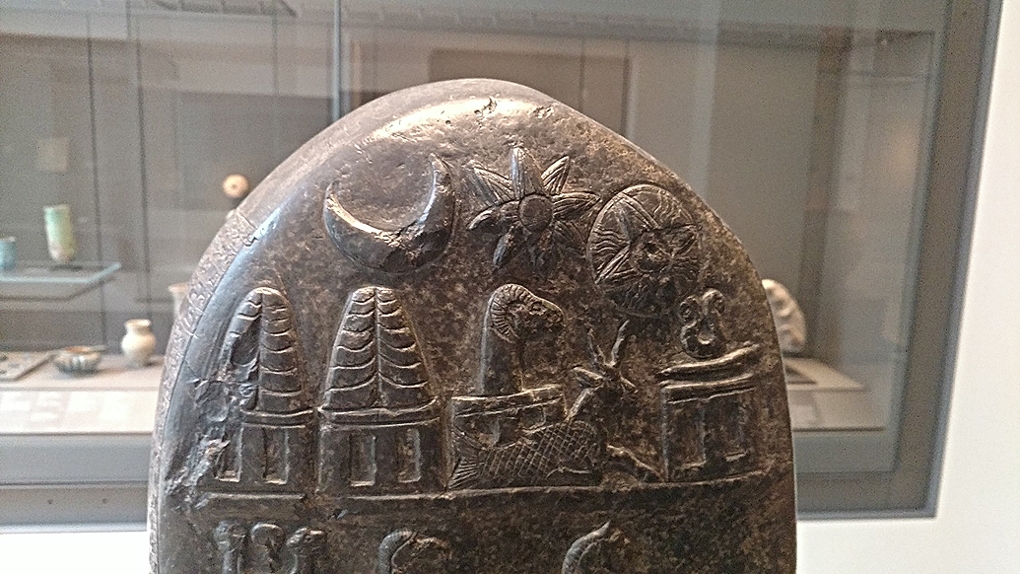 This common Kudurru (boundary marker) dates to the Kassite Babylonian period – around –1200-800; at the top, watching over the contract are Sin, Shamash, and Inanna, left to right as the crescent moon, sun, and starburst. It was stones like these that the Bible forbade anyone moving: